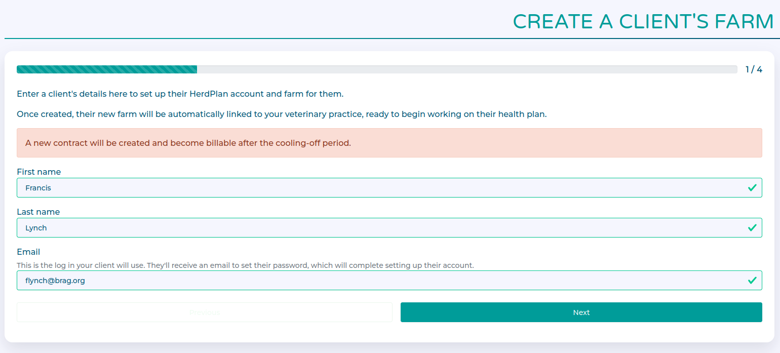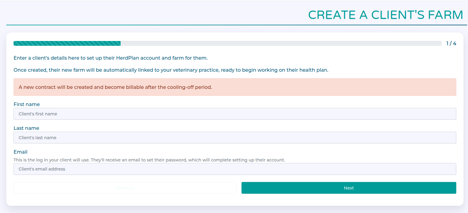 This form guides you through setting up a client account and a Farm on their behalf. Note that this sets up a new contract.