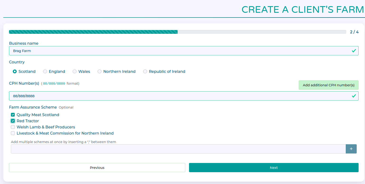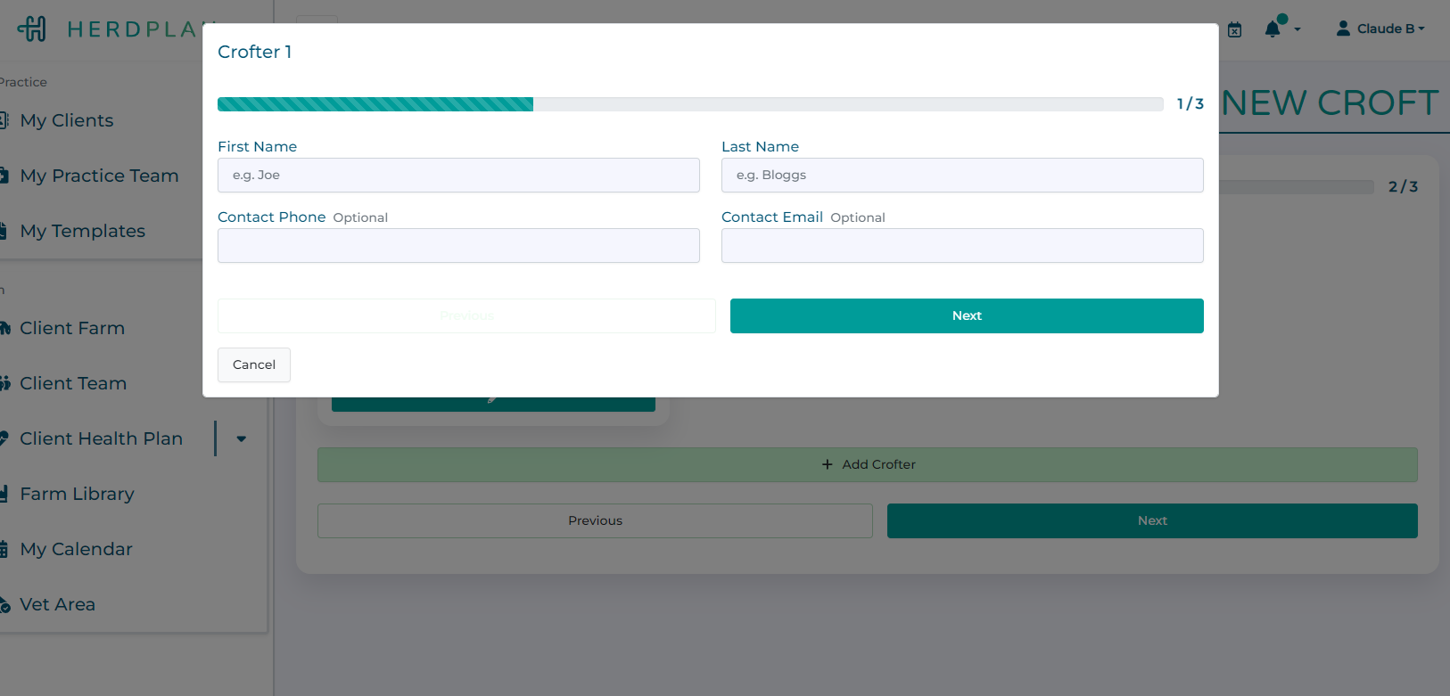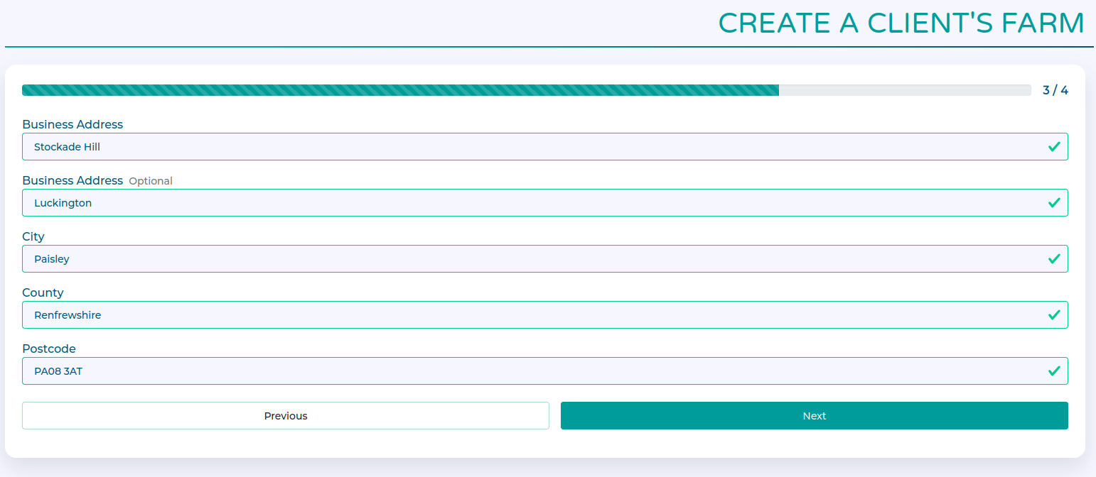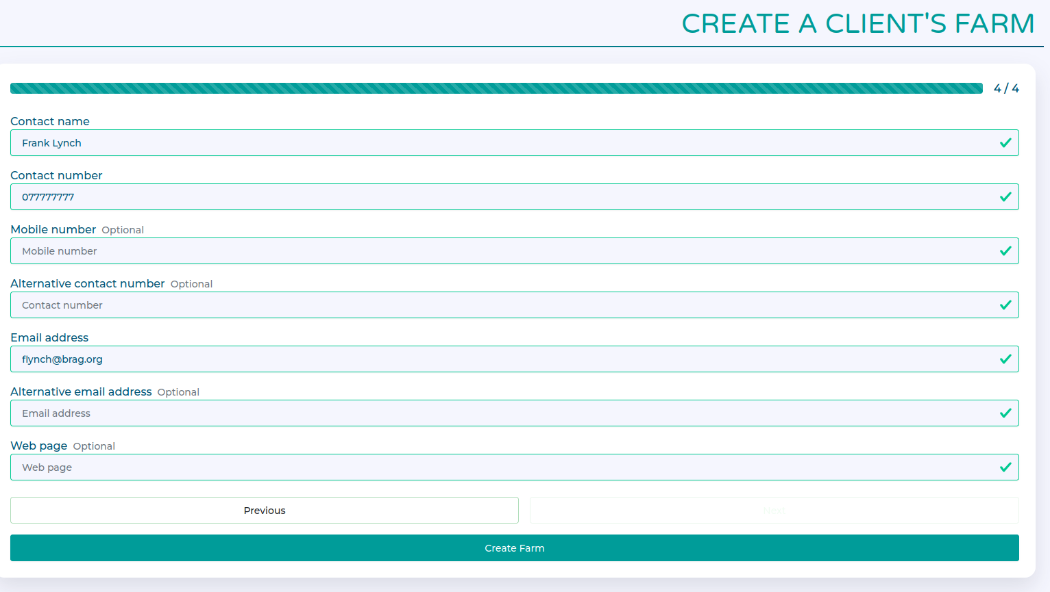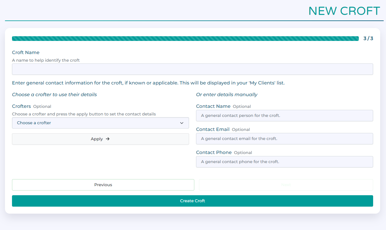 On the final page, enter a croft name to help you identify it in the system. Optionally, you can add general contact details for the croft which will be displayed in the My Clients list. These can be entered manually or can be quickly copied over from one of the crofters.