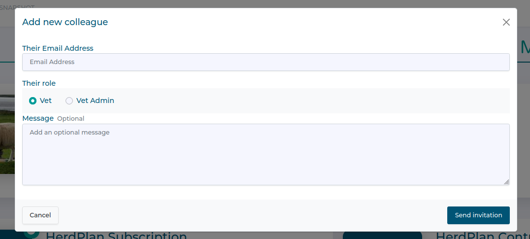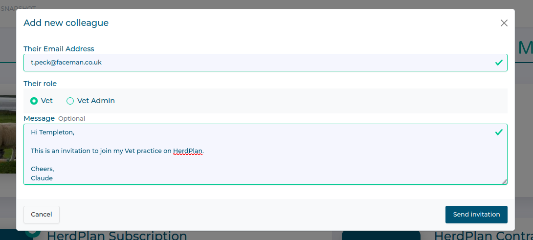 Once finished, click 'Send invitation' and they will receive an email inviting them to join HerdPlan and your practice.