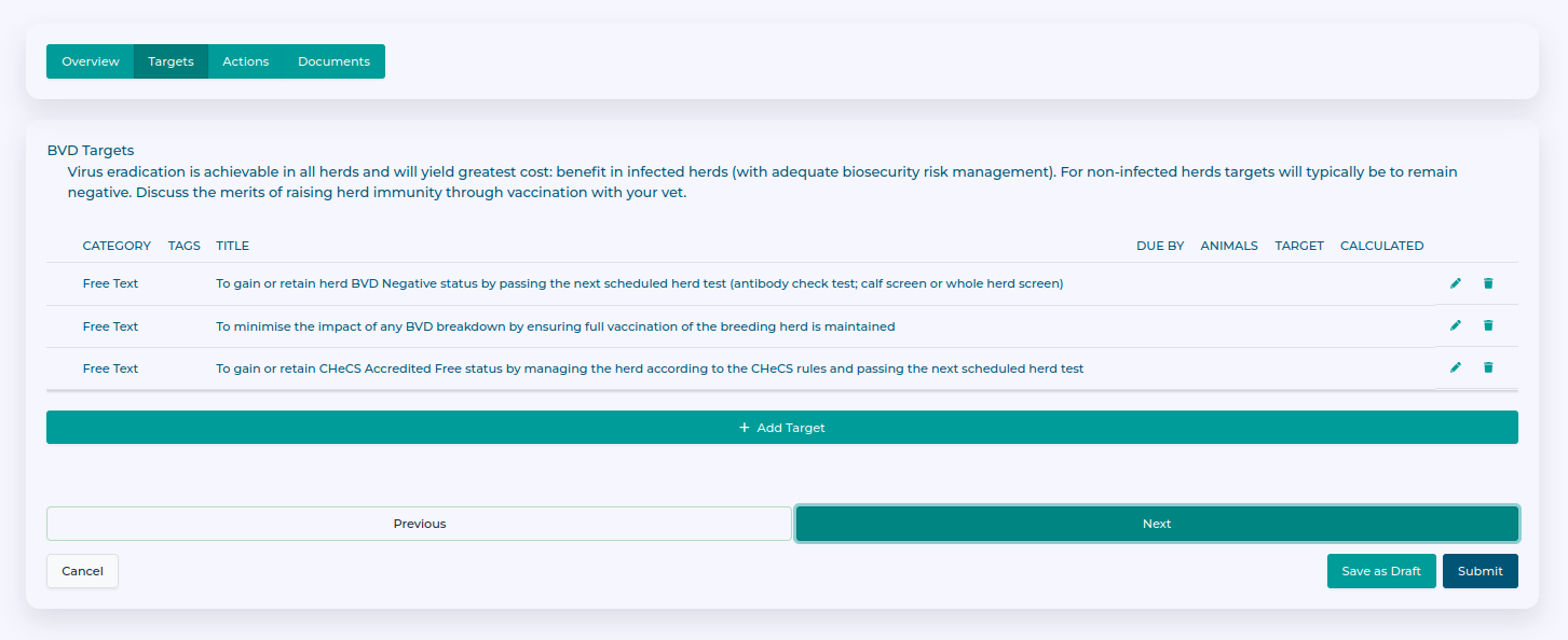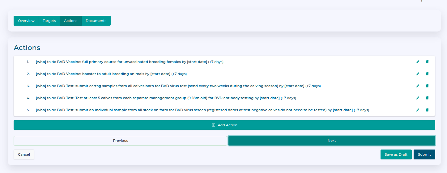 Health Plans are made up of modules which capture targets and actions for livestock groups. Clients use templates to set up these modules, and templates define suggested default actions and targets.