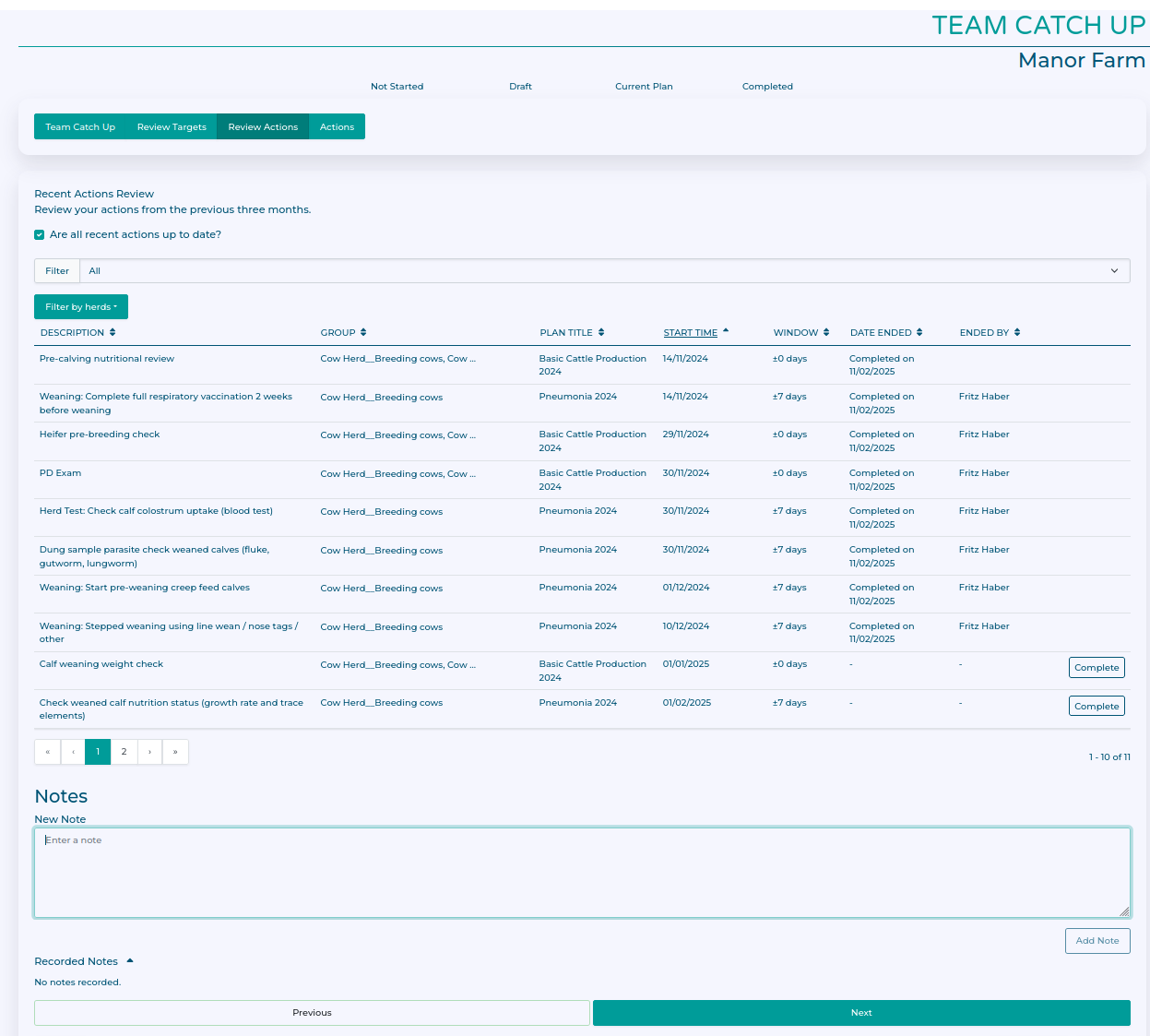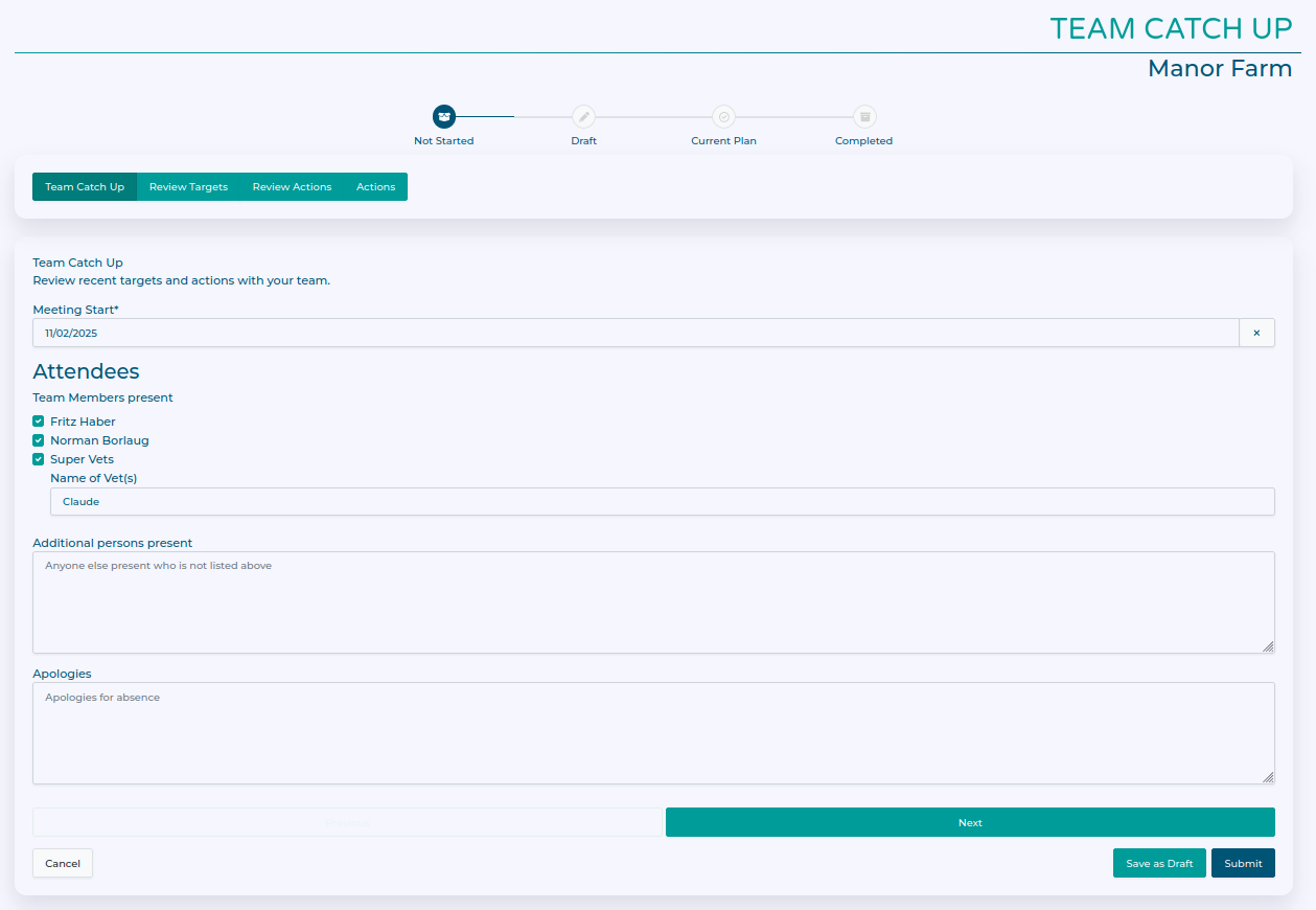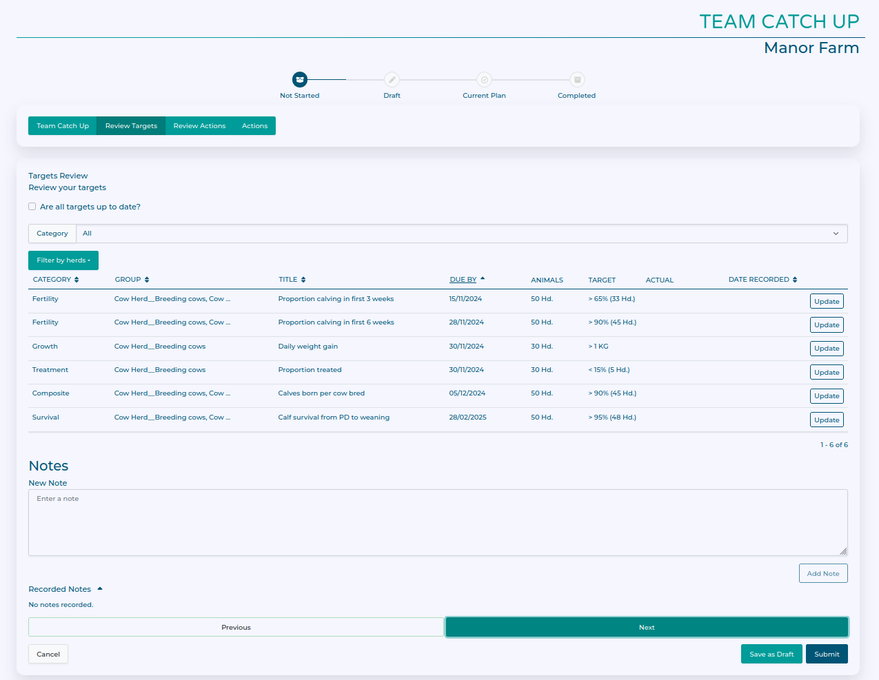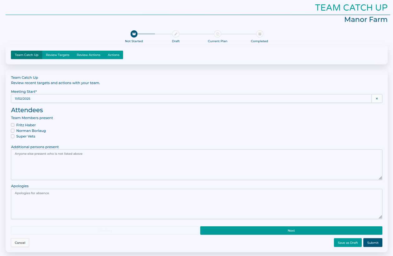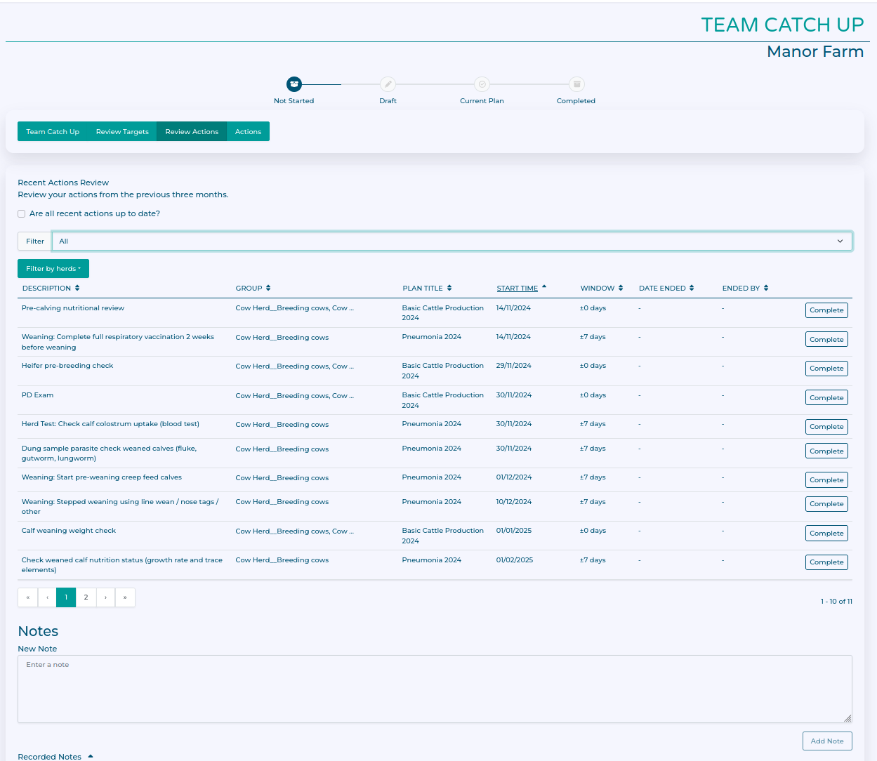 The Team Catch up meeting is an important process in HerdPlan. It gathers all the actions and targets from across all the modules and livestock groups and presents them in one place.