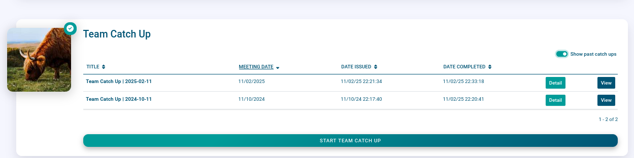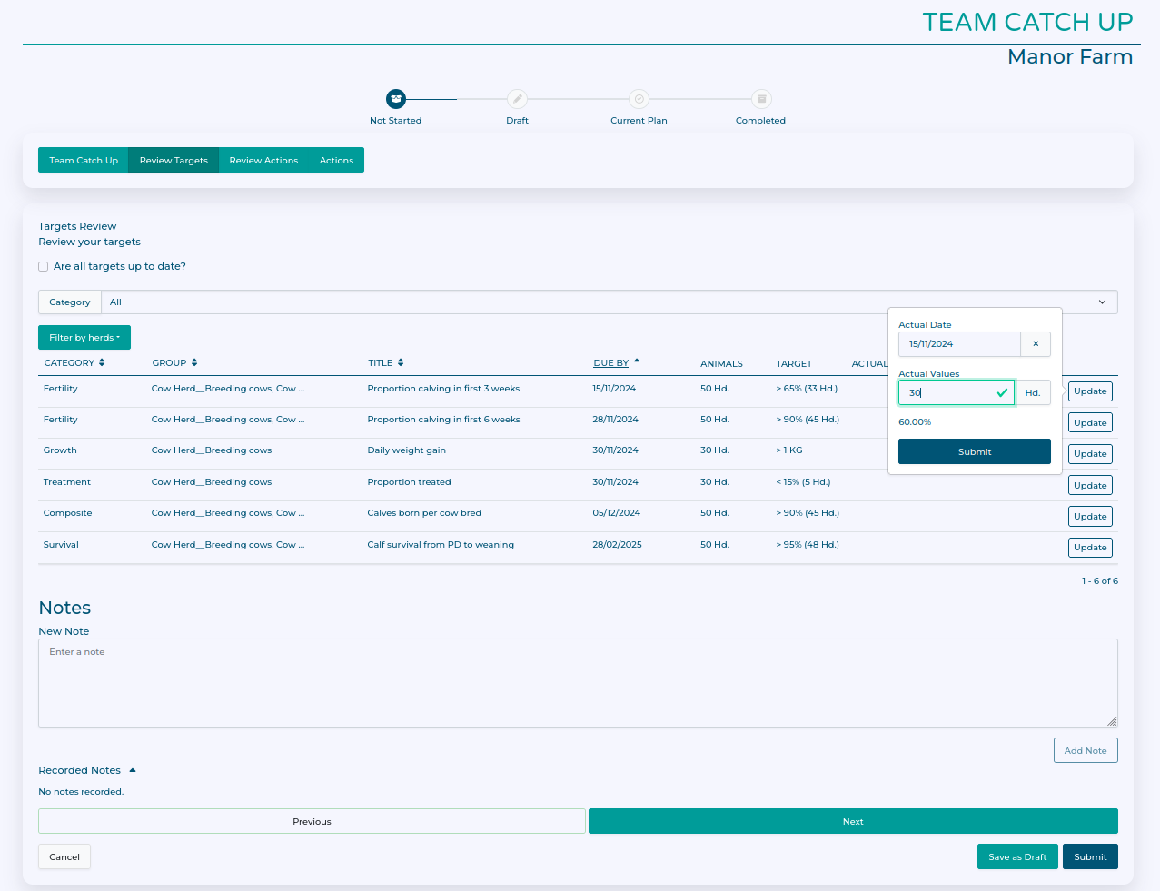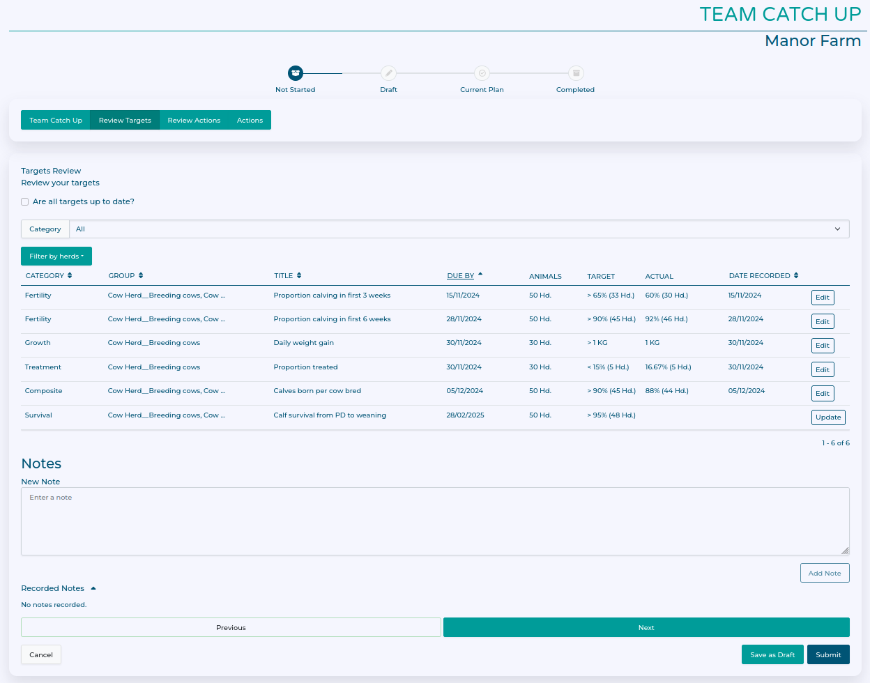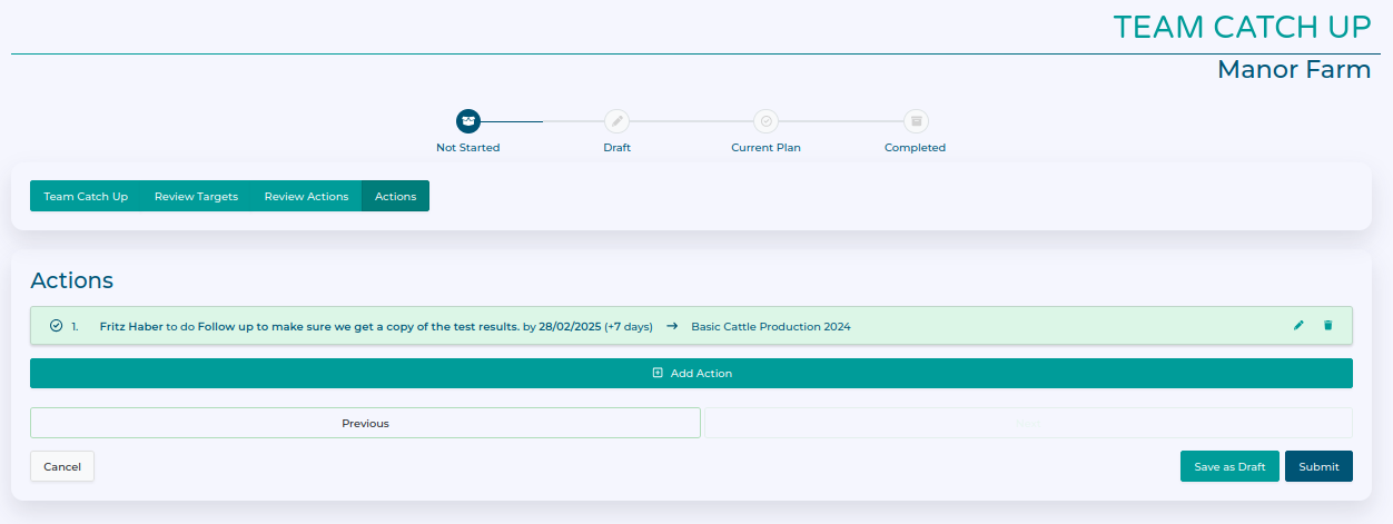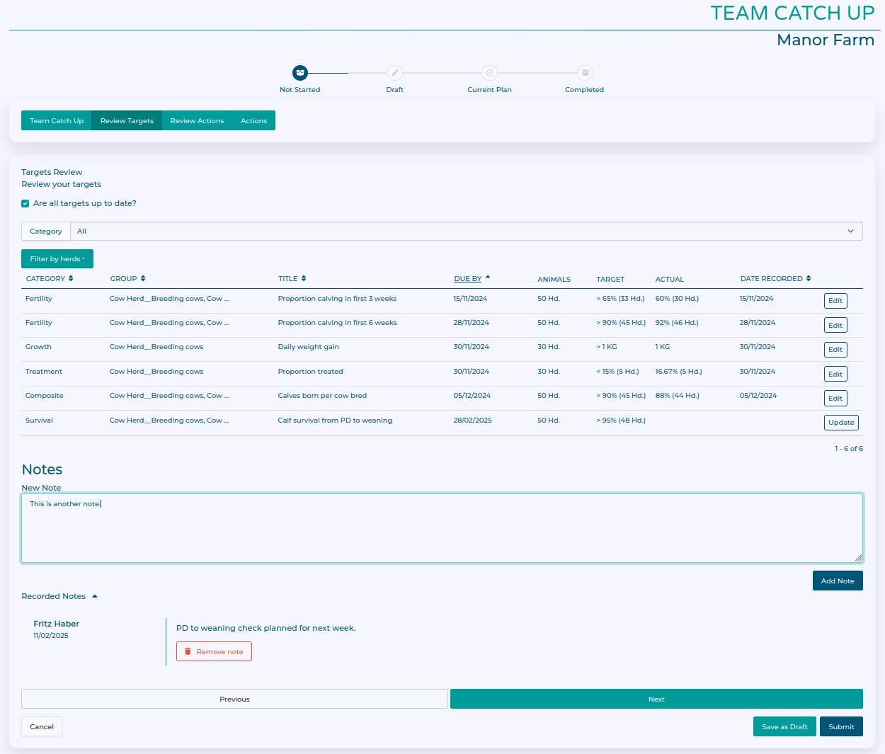 The Team Catch up meeting is an important process in HerdPlan. It gathers all the actions and targets from across all the modules and livestock groups and presents them in one place.