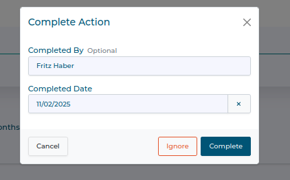 Complete an action by clicking the relevant Complete button. You can then make a note of who completed the action, and when.