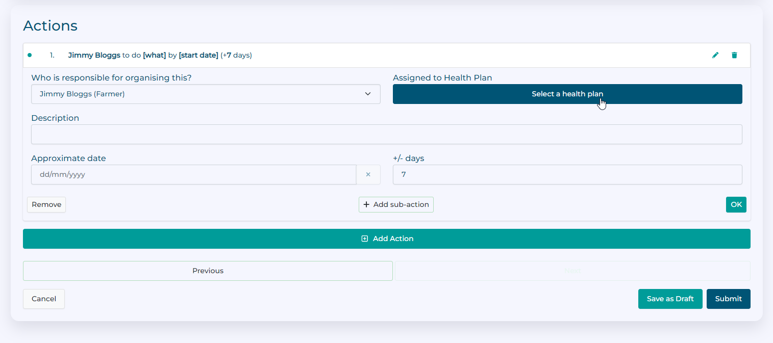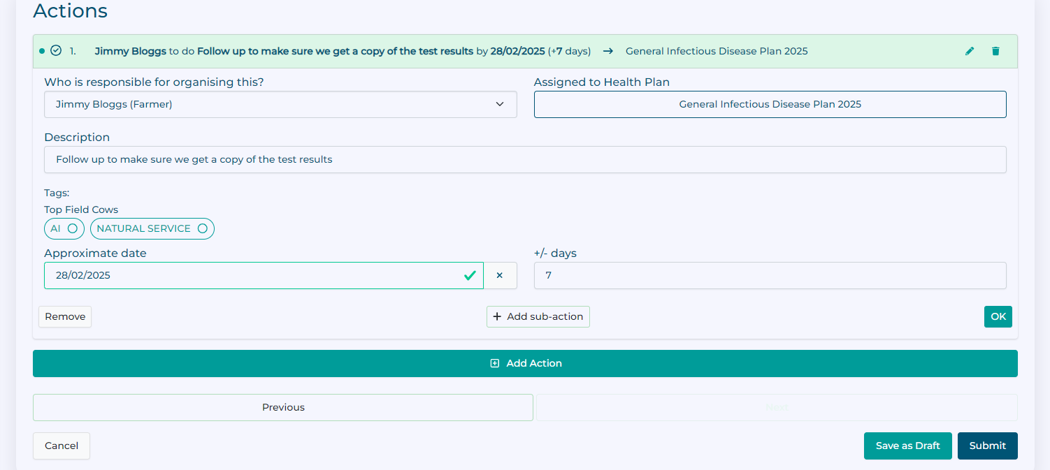 Complete the action's details (i.e. the what, who, and when of the action), and then press OK once you are finished. If you have chosen an existing health plan to assign the action to, it will be possible to use any tags from the animal group(s) linked with that plan.