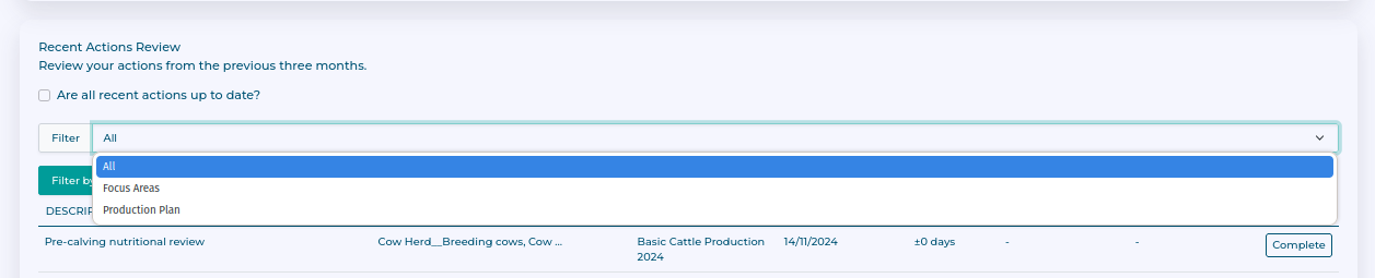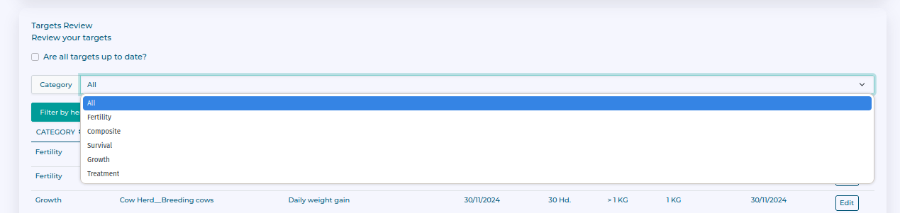 You can filter these down to specific modules with the dropdown. Or filter to specific herds with the Filter by herds button. This allows you to review targets more easily when discussing particular livestock groups or issues, rather than just dealing with them chronologically.